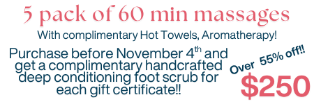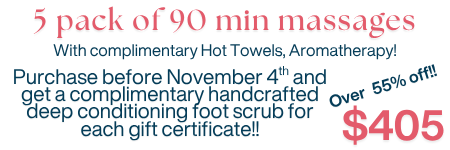 Rediscover the art of relaxation this season with a massage experience designed to melt away stress and restore balance. Each visit now includes a complimentary handcrafted foot scrub, created with aromatic salts, rich oils, and seasonal botanicals to renew and soften tired feet. As the warm towels wrap around your skin and the scents of cinnamon, vanilla, and sweet orange fill the air, tension gives way to tranquility.